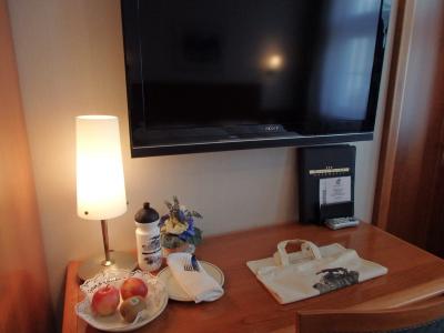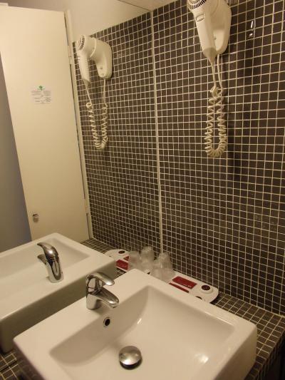 駅から徒歩1分、見つけやすいホテルです。エコノミーのシングルルームでしたが、シングルベッドに、ソファベッドが備わり、スーツケースを広げっ放しにおけるスペースもゆったりしていました。大きなTV、TEL、ドライヤー、広いテーブルセット、エアコンがない代わりに扇風機、室内金庫、BOXティッシュ、ボールペンなどが備えられていました。ちょっとトイレのスペースが狭いかも?
