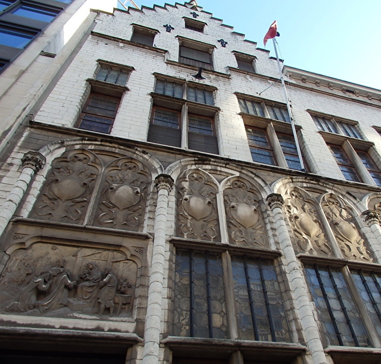 メッヘレンでは3つの市庁舎があり、現在のものがグローテ・マルクトの東側に面して建つ3つの建物が隣接する建物に入っています。グローテ・マルクトの西側には現在は郵便局として利用されている14世紀の市庁舎、そしてその間の南側のステーン通りに面して建つ13世紀の市庁舎(カフェと観光案内所が入っています)と共に、グローテ・マルクトを取り囲んでいるのです。