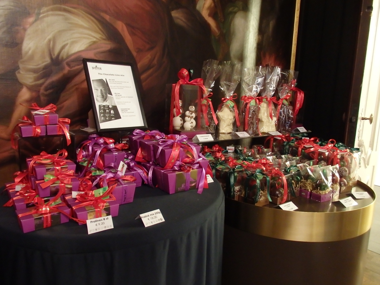 この建物は、1745年に建てられたアントワープの大富豪の大邸宅だったもので、後にナポレオンやウィリアム1世といった権力者のアントワープでの住居として利用されてきました。なので、お店ではあるのですが、一歩店内に足を踏み入れたら、壁一面に描かれた絵画や装飾が豪華で、宮殿の見学に来ている雰囲気に浸れます。廊下の奥にあるキッチンでの作業も見学できる時間帯がありますので、タイミングが合えば覗いてみてください。