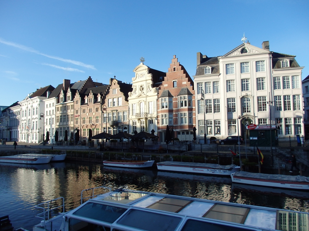 ゲントの中心的広場コーレンマルクトのすぐそばを流れるレイエ川。このレイエ川に架かる聖ミヒャエル橋からGrasbrugという橋までの東側の川沿いに広がるギルドハウスの並びがグラスレイと呼ばれています。グラスレイとは「香草河岸」という意味があり、中世から近世にかけて、ゲントでは川や運河を利用した海運業・商業が発展。その中心拠点となったのがこのグラスレイ。12世紀~17世紀のギルドハウスをはじめとした壮麗な歴史的建造物が集中しています。階段型の切妻屋根のあるファサードはベネルクス地方の特徴で、これらの建物には現在レストランやカフェが入っています。