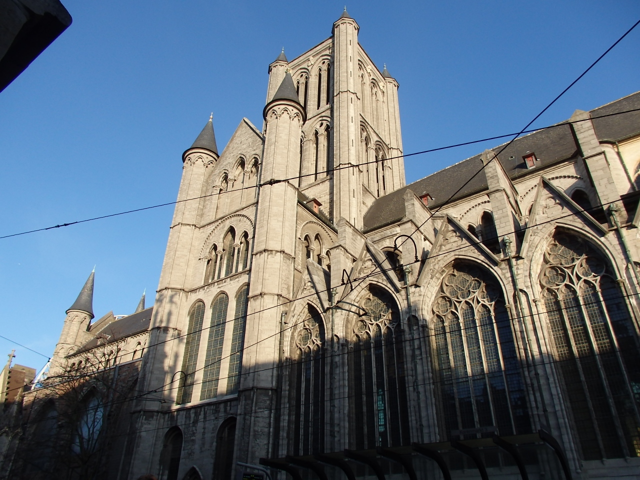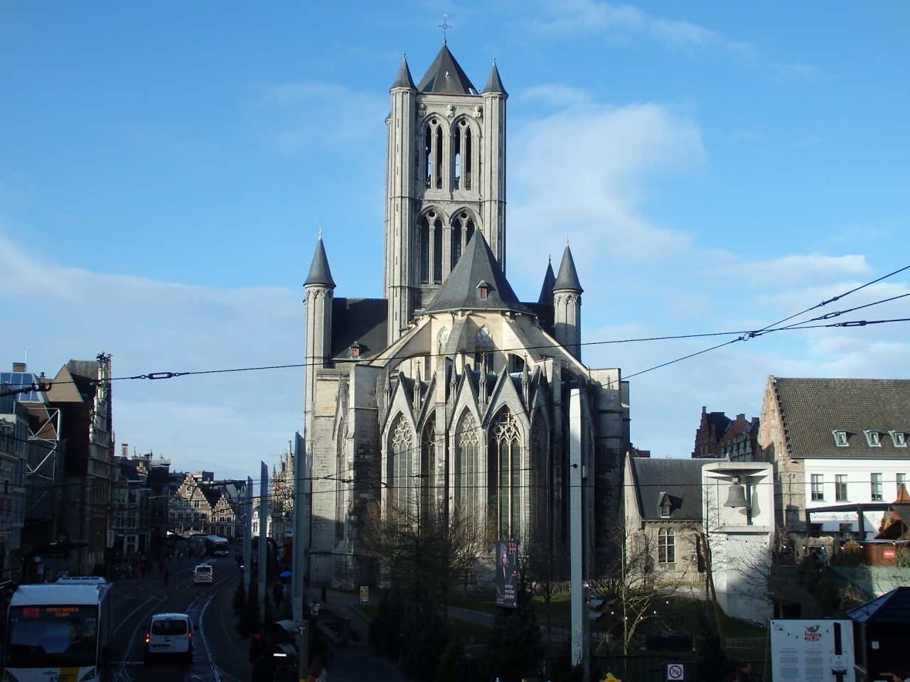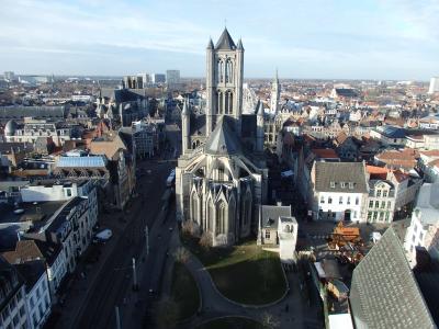 ゲント旧市街の中心地コーレンマルクトにトラムで到着した時、目の前に聳えるように建つのが聖ニコラス教会です。スヘルデ・ゴシック様式の最高傑作とされ、トゥルネー地方産の青灰色の石が使われているその荘厳な美しさは圧倒的。元の教会は12世紀にはロマネスク様式による小さな木造の建物でした。13世紀に新しく建築が始まり何世紀にも渡って増改築されてきました。ゲント商人の富と文化の高さを象徴する教会でもあり、教会内には素晴らしい絵画やステンドグラス、彫刻がたくさん飾られています。