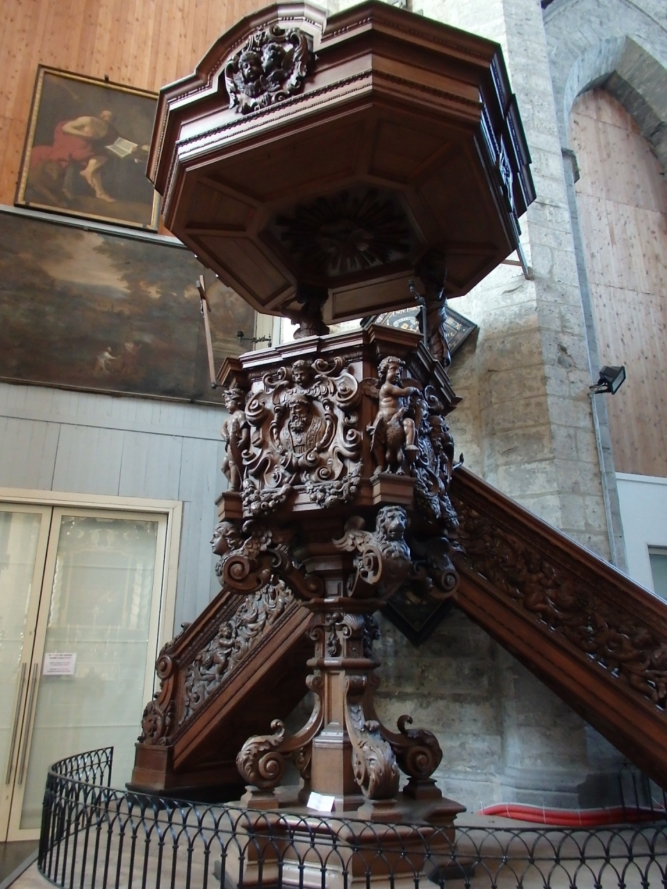 聖カルロス・ボロメウス教会はイエズス会により1615年から約6年の月日をかけて建てられた教会です。正面ファサードの1階と2階にはドーリア式・コリント式の列柱が並び、美しいレリーフや彫像などで飾られています。これは、かのルーベンスが関わったそうです。ルーベンスの作品はかつては祭壇画や天井画に取り込まれていたのですが、1718年の落雷による火災時にほとんどが焼失してしまったとのこと。でもしっかり修復された現在の内部の素晴らしい絵画や彫刻などを見ることができますので、ぜひ足を運んでみてください。いくつもある祭壇や2段重ねになったアーチの奥壁面は素晴らしい絵画や彫像があり、木彫り装飾が素晴らしい説教壇もあって、いつまでも眺めていたくなります。