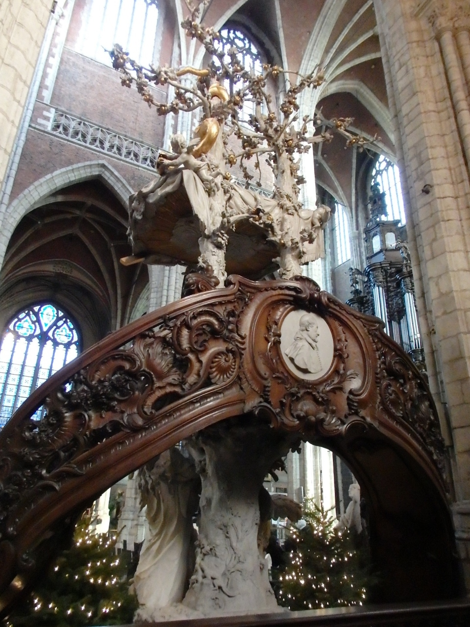 白い列柱のどの柱にも聖人像が施され、美しいステンドグラスや木彫り装飾が見事な説教壇、絵画など見応えがあります。中でもヴァン・ダイクの祭壇画「十字架のキリスト」は見逃せません。- 旅行時期