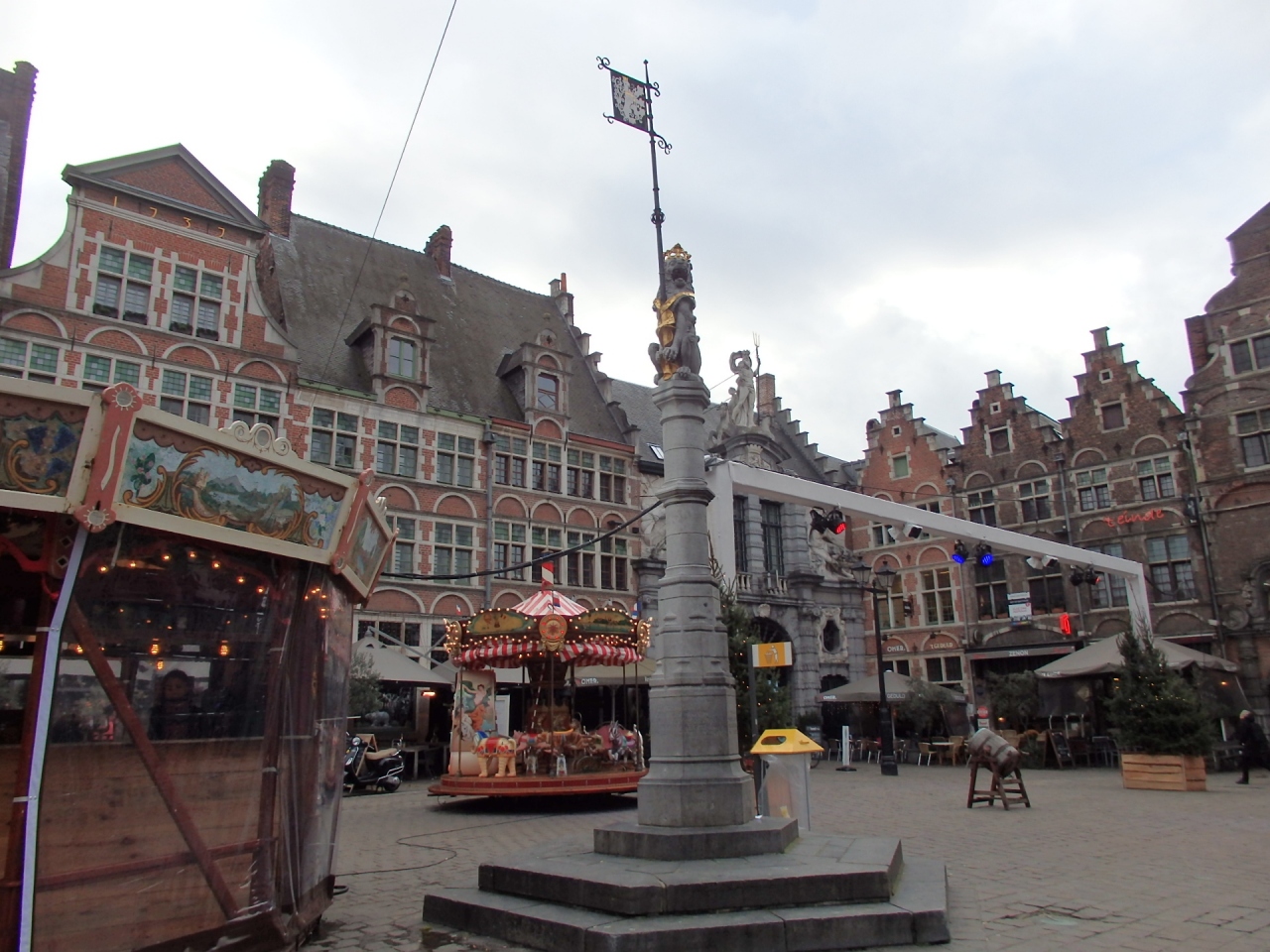 レイエ川が三つ又に分かれる北側に位置するゲントで最古の広場です。広場の北向かいにはフランドル伯の居城があり、トラム停留所があって移動にも便利な立地です。聖ヴェーレ広場の守護聖人はヴェーレという名のゲントの聖女。広場で一番目立っているモニュメントは、旗を掲げたライオン像のある柱。一番奥には旧魚市場の入り口があります。