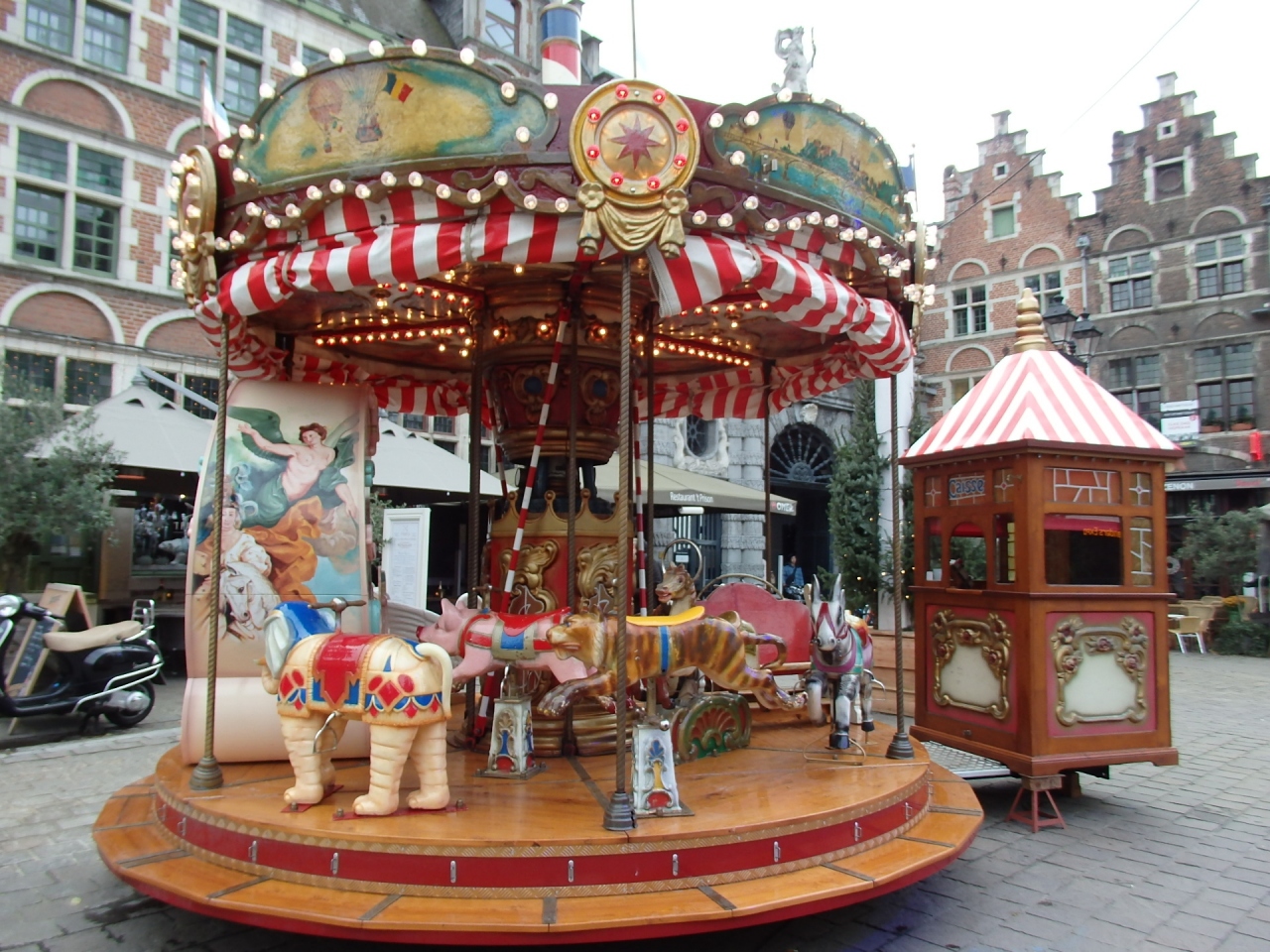 この広場は中世の時代、貨幣偽造者を処罰する刑場だったそうですが、現在はレストランやビール専門店などが入る建物が建ち並び、テラス席が張り出し、クリスマス時期には可愛いメリーゴーランドが設置されたり、少ないけれど屋台も置かれ、のんびりムードいっぱいの広場です。- 旅行時期