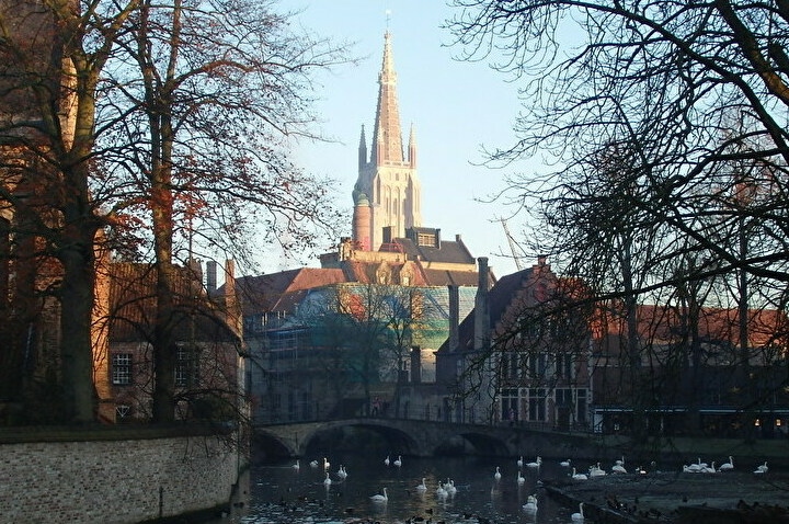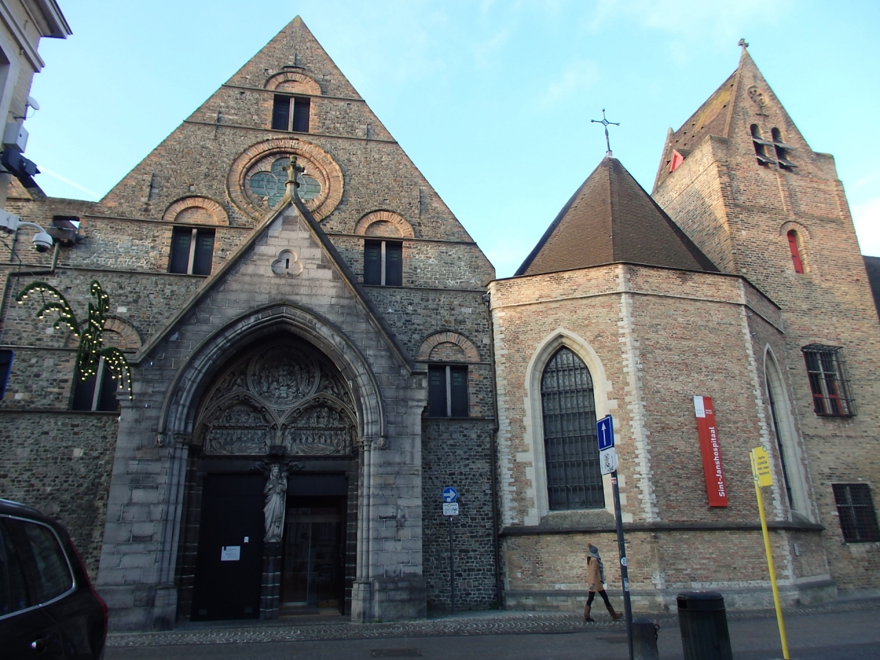 グルートゥース博物館や聖ヨハネ施療院の近くにある聖母教会は、10世紀以前から存在し、12世紀初頭にロマネスク様式で建築されたが1116年に焼失後、「トゥルネー・ゴシック」様式で改築され、改修工事が何度も繰り返され様々な建築様式が混在しています。北側の尖塔は崩壊後に、第二次市壁と同じく西フランデレン産の煉瓦を用いて1361年に完成したもので、高さ122メートルあり町中のどこからも目に入る存在です。