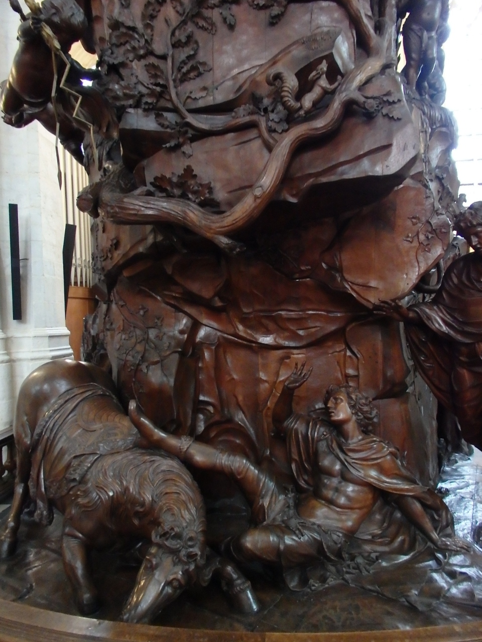 教会内で見逃せないのは、ベルギー7大秘宝のひとつ、レニエ・ド・ユイが1118年に制作した「聖バルテルミーの洗礼盤」。この洗礼盤は、新約聖書に関した4つの洗礼と洗礼者ヨハネの予言という5つの場面をレリーフに表しています。台座の12頭のブロンズ製の牛(現在は10頭)が洗礼盤を支えています。他にも、法衣や宝物も見られました。- 旅行時期