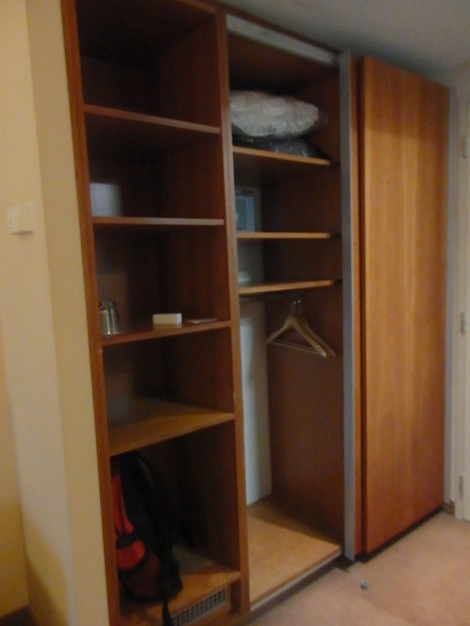 広々とした寝心地良いダブルベッド、電気ポットとコーヒー紅茶セット、TV、TEL、ドライヤー、大きなデスクセット、テーブルセット、箱入りティッシュ、室内金庫や固定式ハンガーのあるクローゼットには棚もたくさんあります。バスルームにはシャワーオンリーでなくバスタブもついており、水圧は弱めですが湯温調節しやすく水捌けも良好でした。
