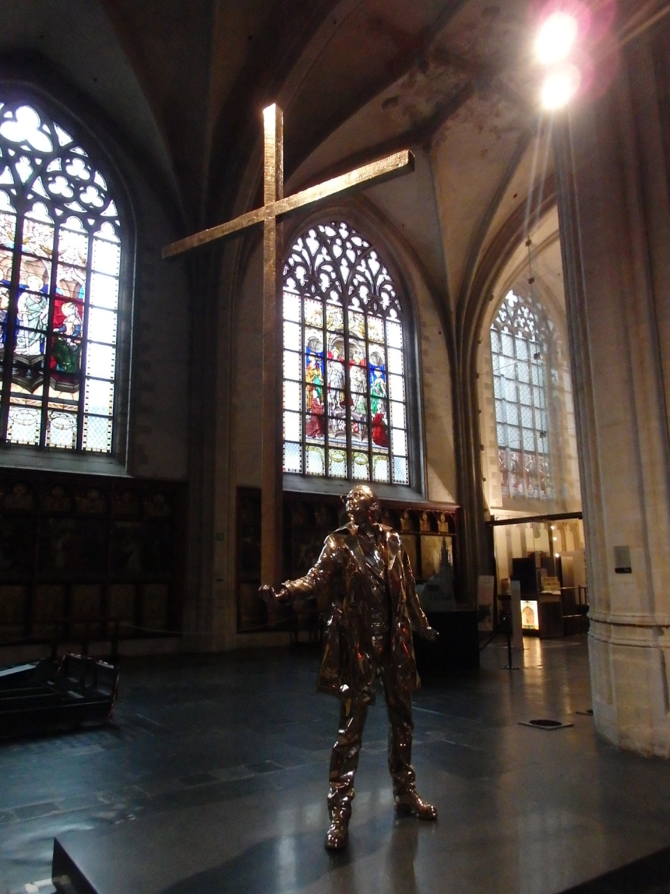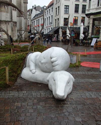 アントワープ中央駅から西へまっすぐ延びる通りを進んで徒歩20分くらいで到着するアントワープ大聖堂前にある白い像です。