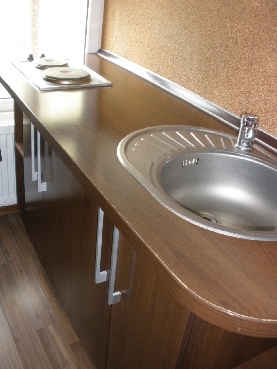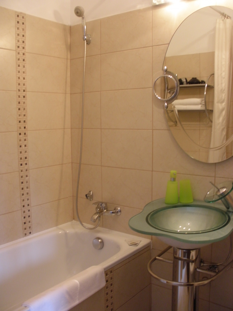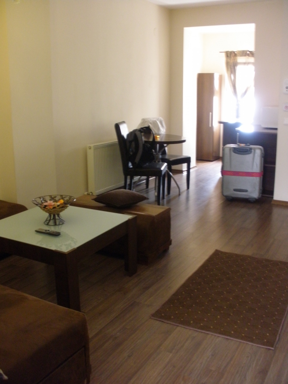 一人では広すぎるくらいで、大きなダブルベッドのスペースたっぷりの寝室に、5~6人座れるソファセットのあるリビング、台所セットの付いたキッチン&ダイニング(電子レンジや4人分の食器やお鍋などもついてます)、バスタブつき(ジャグジーつき)の浴室は使い勝手の良い設備でした。