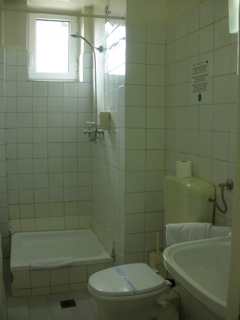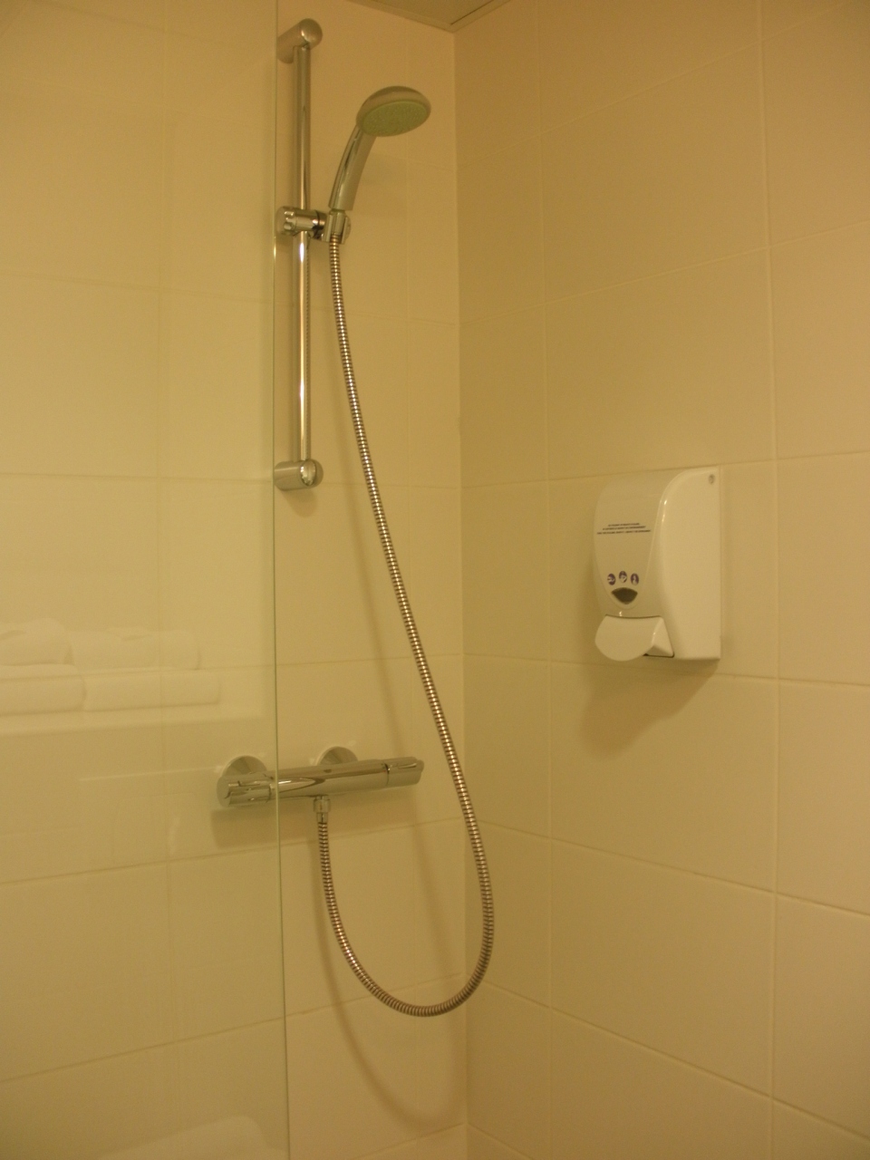 お部屋は、ダブルベッドが置かれ、ちょっと横に移動したらスーツケース広げっ放しでもOKな空間が出来る程度の広さ、浴室はシャワーのみで、ガラスの仕切り版の幅が狭く、お湯が外に飛び出すこともあります。