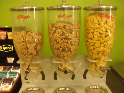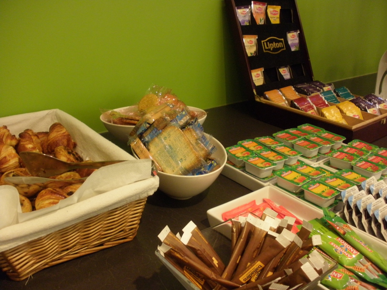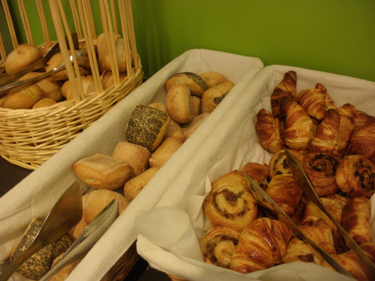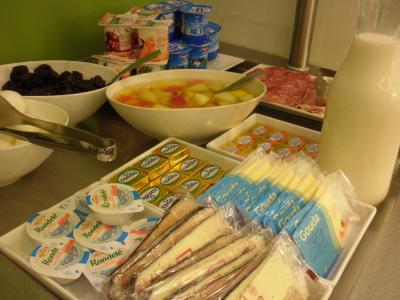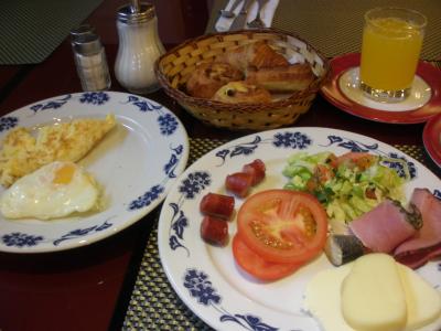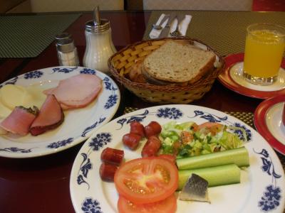 朝食は6:30~10:00、冷たいメニューだけで、シンプルです。(パン2種、クロワッサン、デニッシュ、チーズ2種、ハム2種、ヨーグルト、シリアル3種、フルーツコンポート、冷たいゆで卵、ジュースやコーヒーのマシン)
