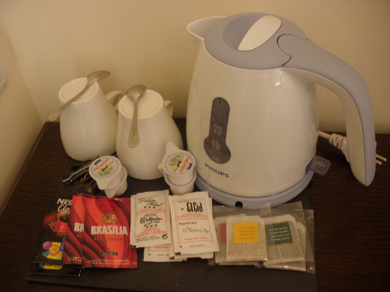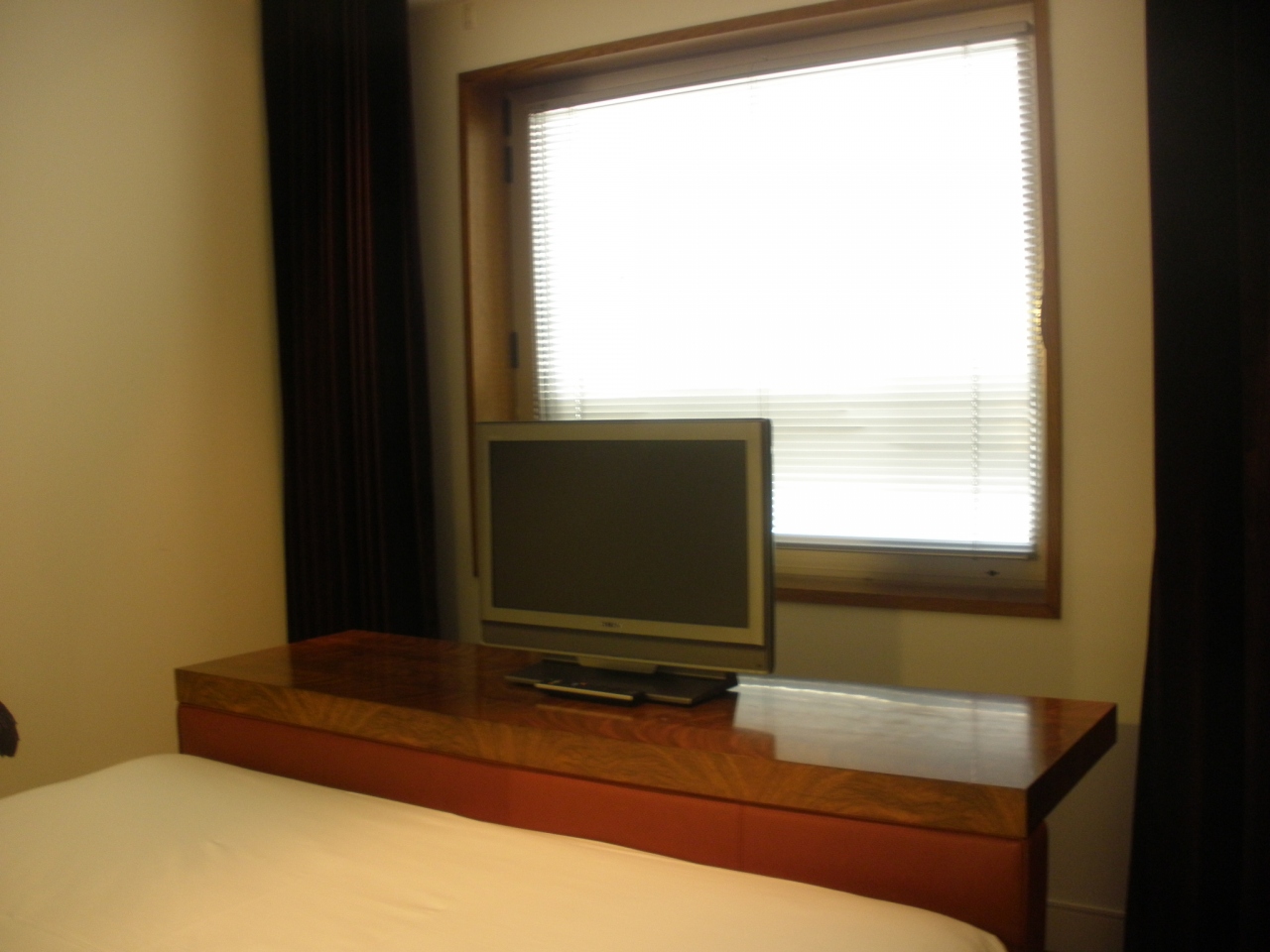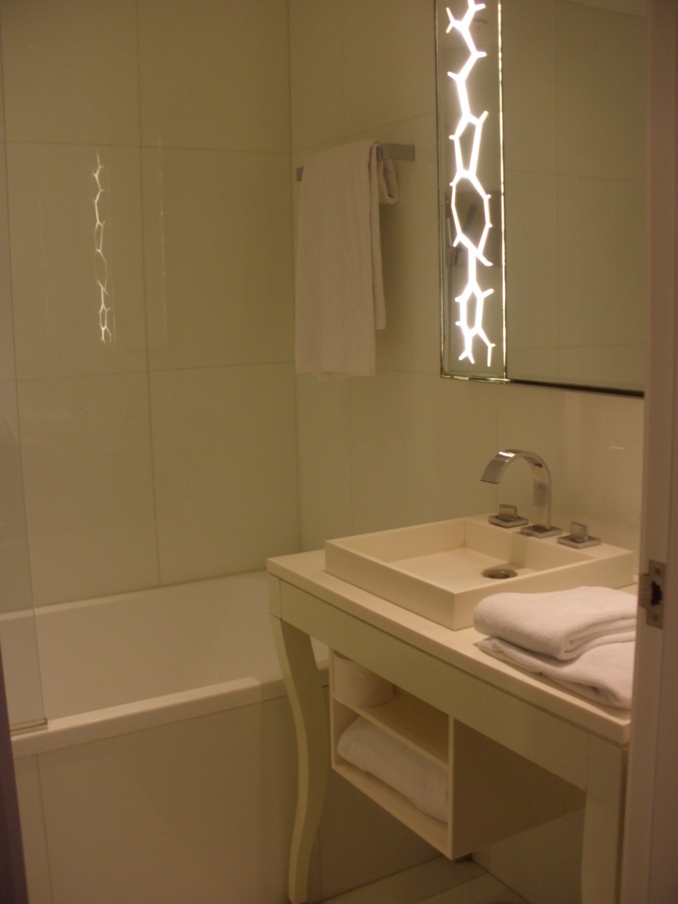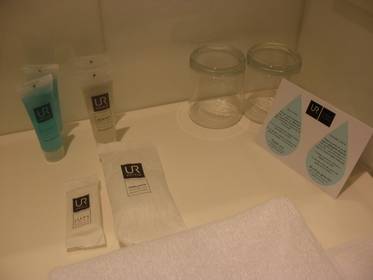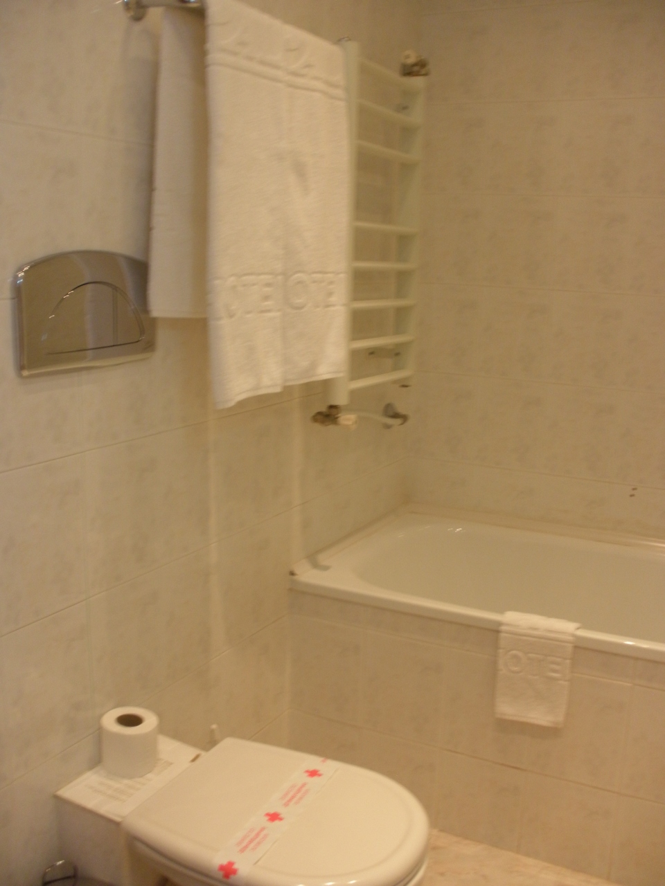 ダブルベッドにブランケットではなく軽い掛け布団が用意され、バスタブやバルコニー(イス2脚)も付いていてゆったりした感じです。TV、TEL(ベッドサイドとバスルームにも付いてます)、ドライヤー、エアコン、ミニバーなど不自由なく付いて、ソーイングセットやメモ帳&ボールペンも置かれています。