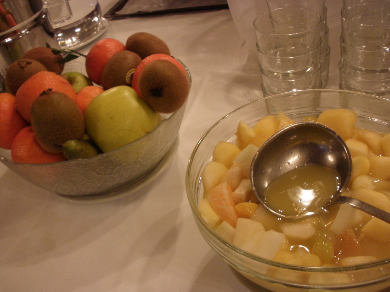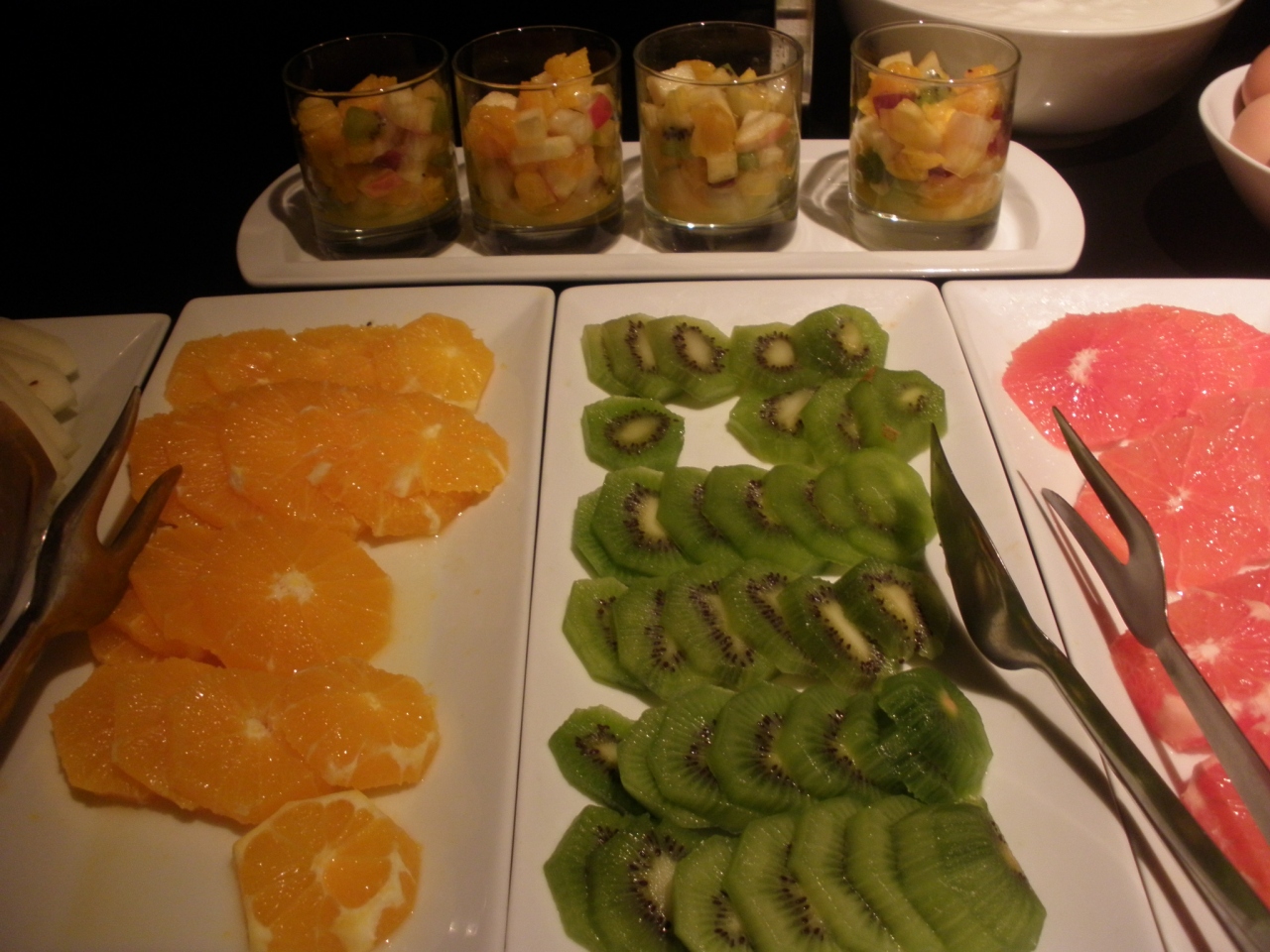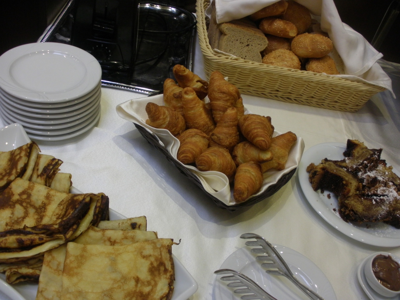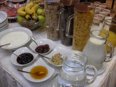 朝食は8:00~10:00、ハム(生ハムもありました)&チーズ、パン数種、クロワッサン、ヨーグルト、フルーツ、シリアル、ジュース2種、ホットドリンクはコーヒーマシンから・・・と、いたってシンプルな内容です。
