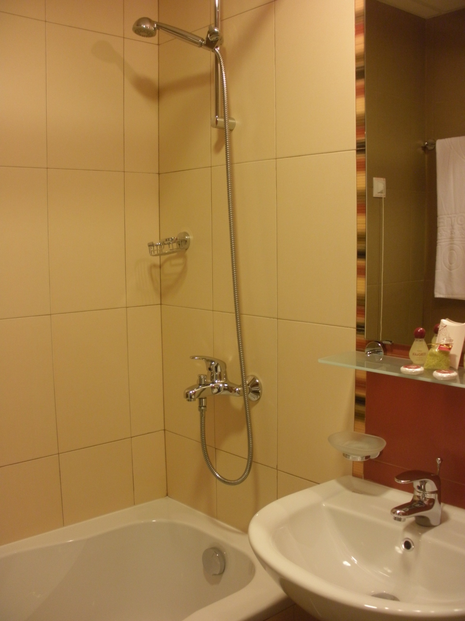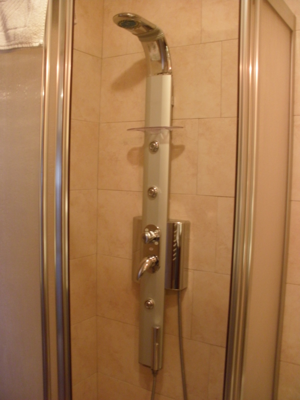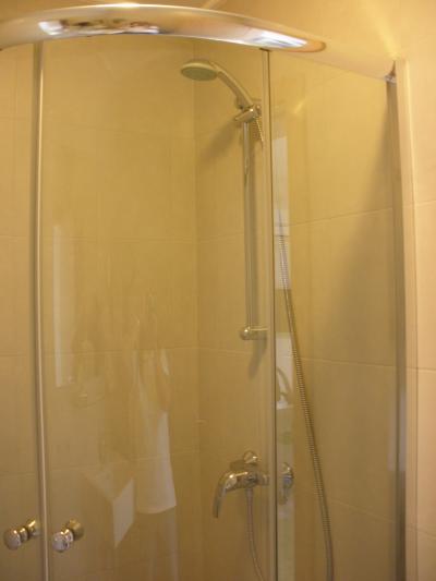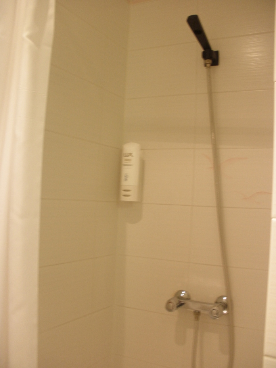 お部屋自体はゆったりしていて良かったのですが、このシャワーが使いづらい!先ずカーテンがないので、トイレの方までお湯が飛んでいかないように苦労したのと、足元マットがないので、バスタオルを敷いて利用するはめに。。。幸い、バスタオルは二人分置いてくれていたのがよかった。TV,TEL、デスクセット、冷えないエアコンと冷蔵庫があったけれど、ドライヤーやタオルかけがないので不便を感じました。