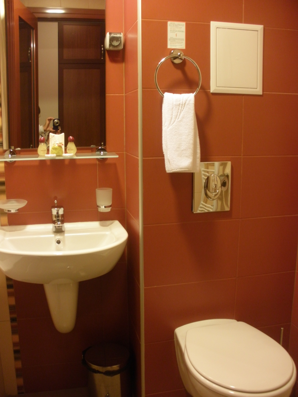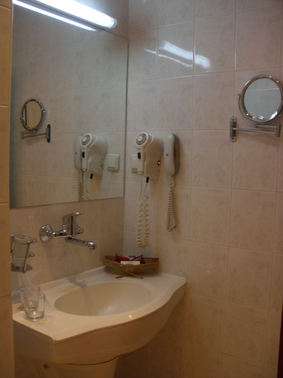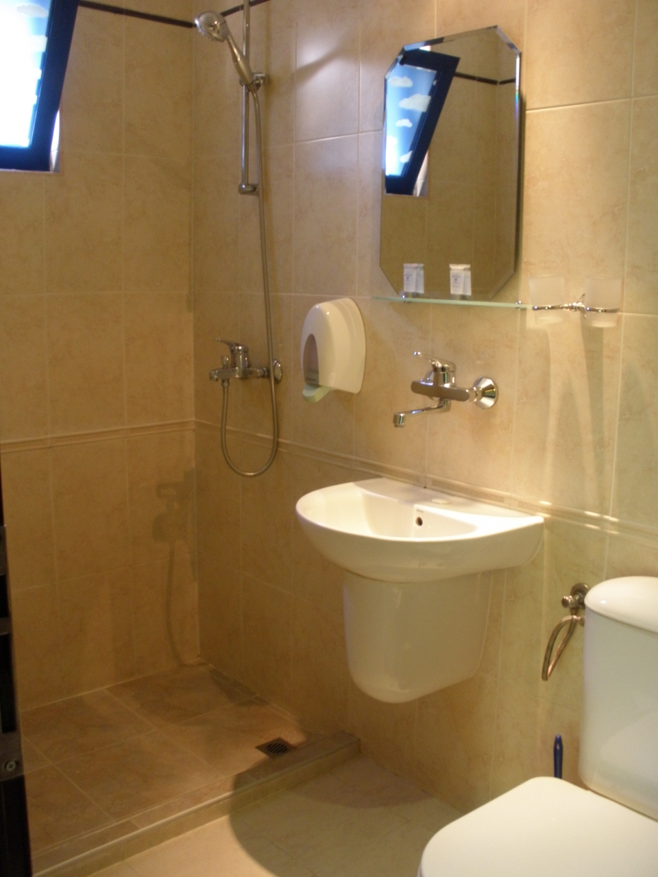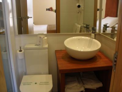 お部屋自体はゆったりしていて良かったのですが、このシャワーが使いづらい!先ずカーテンがないので、トイレの方までお湯が飛んでいかないように苦労したのと、足元マットがないので、バスタオルを敷いて利用するはめに。。。幸い、バスタオルは二人分置いてくれていたのがよかった。TV,TEL、デスクセット、冷えないエアコンと冷蔵庫があったけれど、ドライヤーやタオルかけがないので不便を感じました。