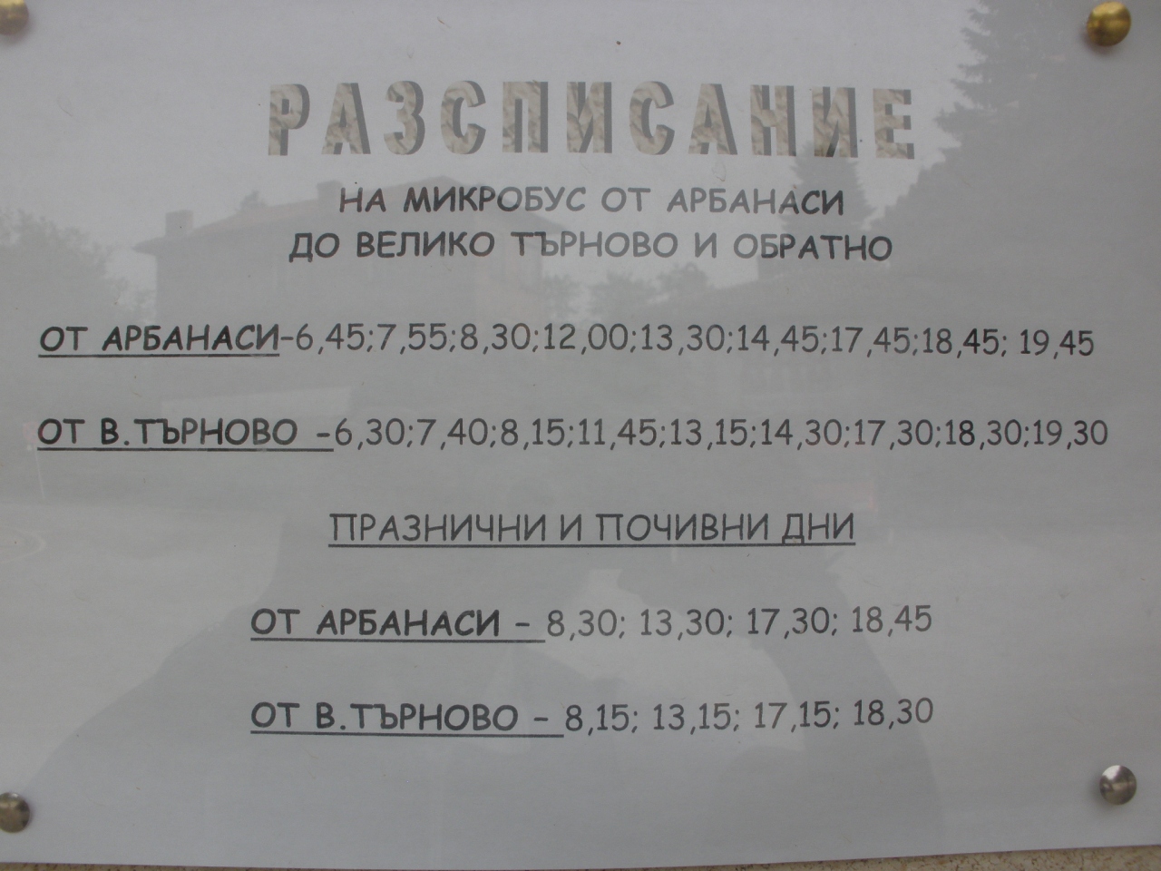ヴェリコ・タルノヴォのバス通りにあるアルバナシ行きのミニバスに乗って20分足らずで到着したバス停には、行きと帰りの時刻表も張っています。
