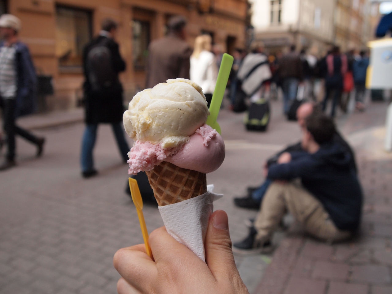 ガムラスタン旧市街に入って少しした所に、お店でワッフル生地を焼いてその上にアイスクリームを乗せてくれるお店があります。ここのアイスクリームはお薦めです。「MUREN」と言うお店です。食べてみる価値ありですよ。