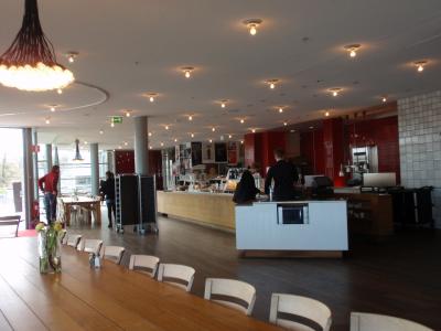 現代美術館のロッカーが並んでる所の突き当り左側にあるカフェは見晴らしがとても良い。海を見ながら昼食をしてきました。ケーキ、パン、サラダ、スープ等品数豊富のセルフサービスなので、お気軽に利用できるカフェでした。