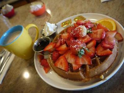 ワッフルで、ストロベリーをつけました。