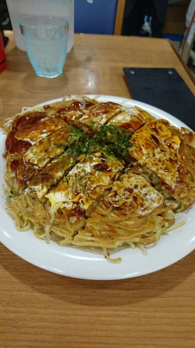 お好み焼きの生地は薄いけどもっちり。そばはイイ感じに焼かれた部分がカリっと香ばしく、噛んだときのサクサク感も楽しめました。