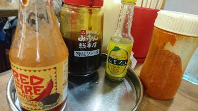 また、ソースはもちろん、マヨネーズ、カラシマヨネーズ、一味唐辛子、タバスコ、レモスコ(タバスコのレモン版)など、味に変化を加える調味料も豊富に揃えてありました。