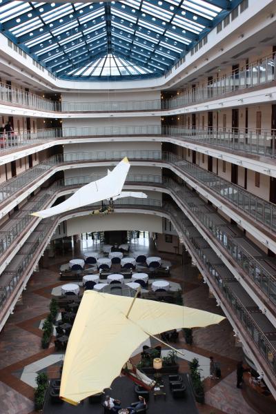 大きなカイト?が吊るされて、開放感のある大きな吹き抜けの