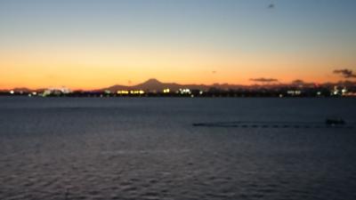 バルコニーから眺める、夕陽のなかの富士山のシルエットが