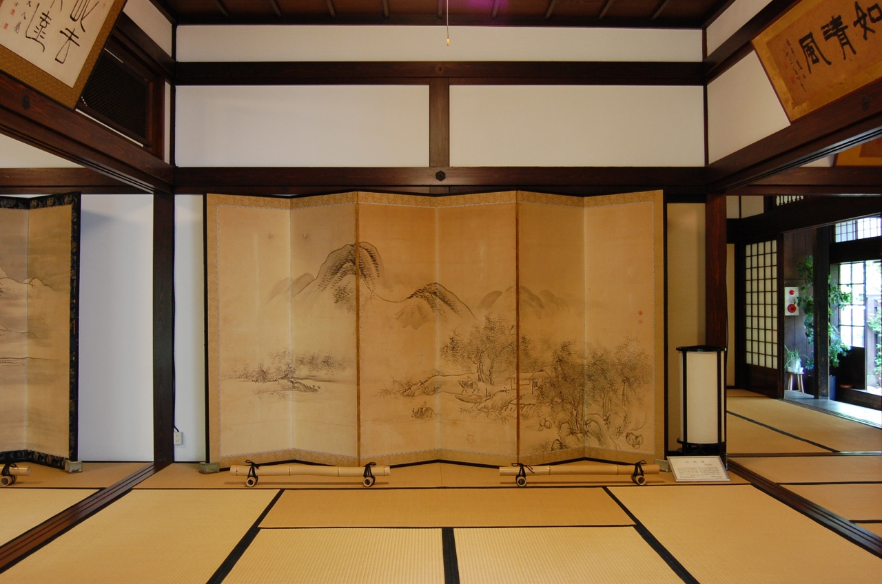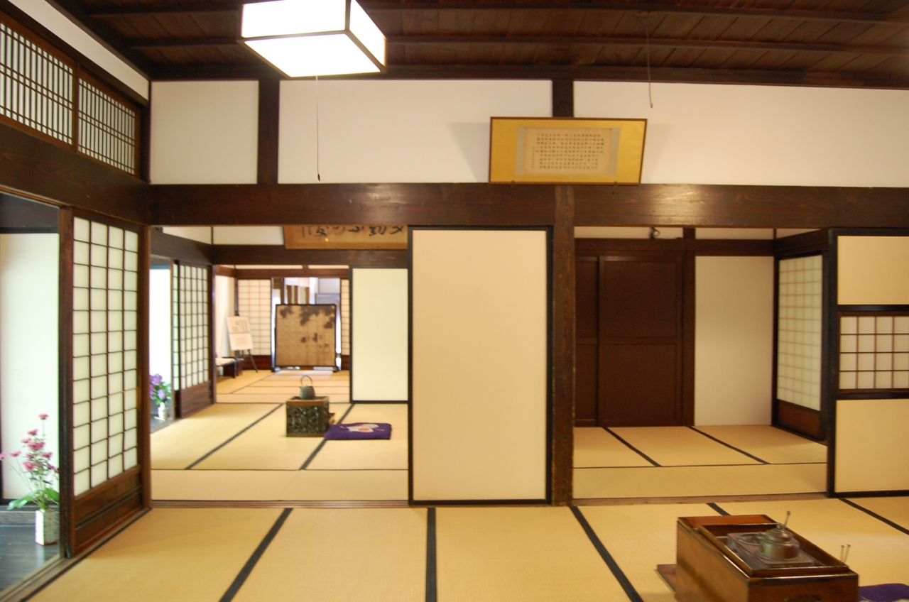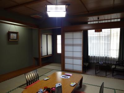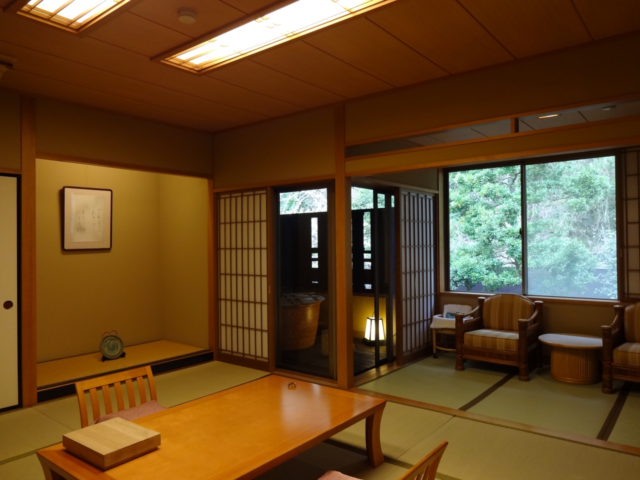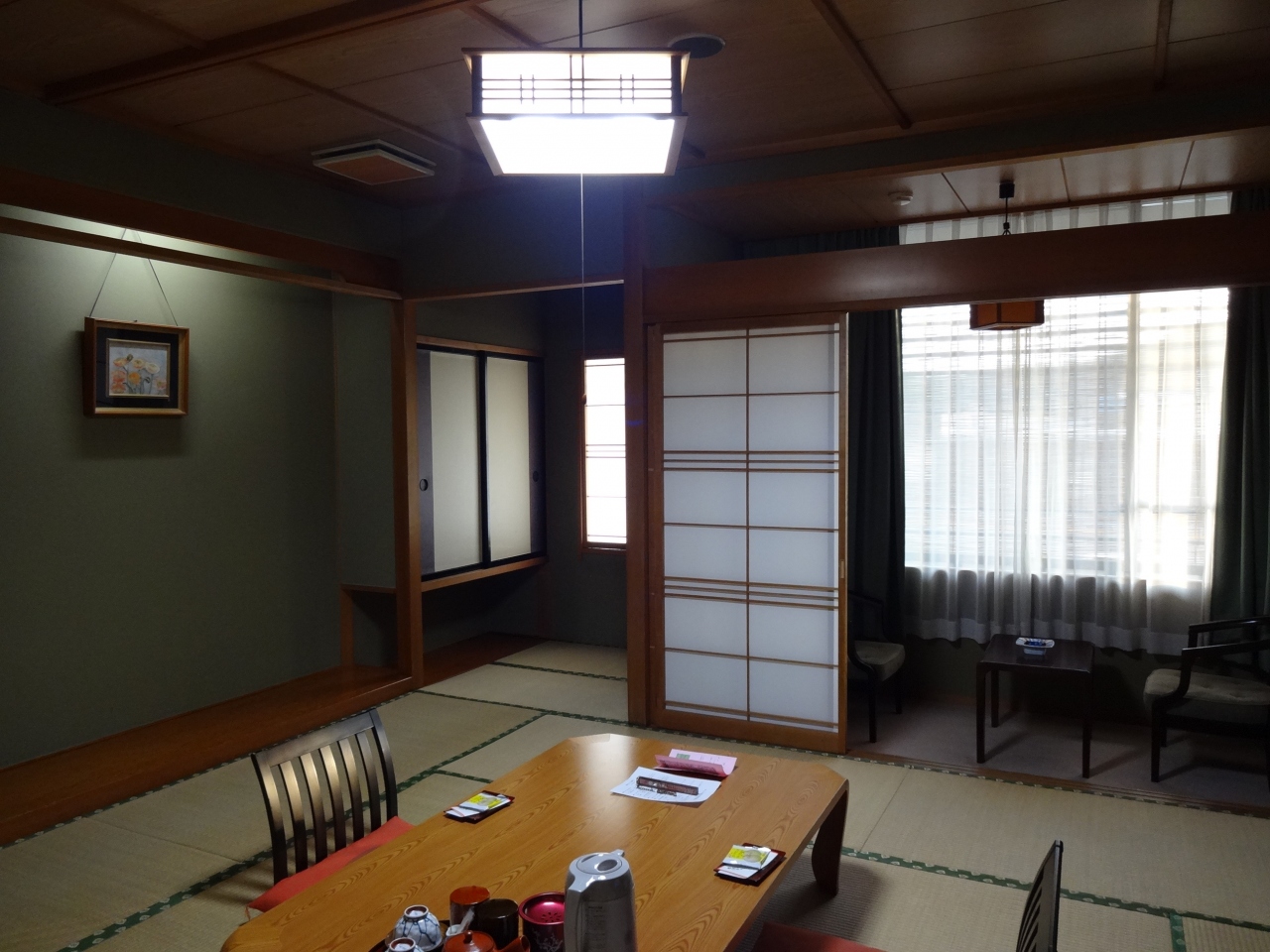 部屋は南館2階。広さはまずまず。東側と西側があり、西側のため庭や景色は望めず、逆に外から見えてしまうので、窓外にすだれがかかっています。バイパスと反対側なので静かなのかもしれませんが。ちょっと照明ががっかりですね。