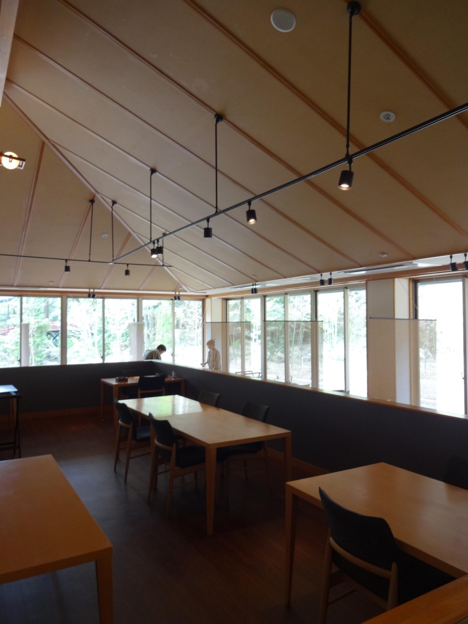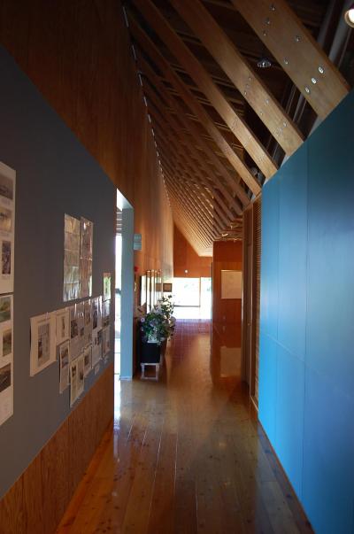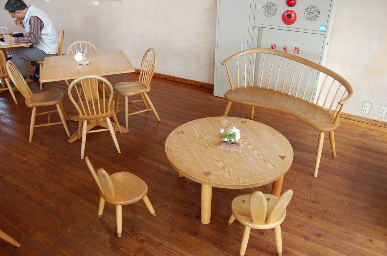 連続した木造の屋根は安曇野の風景と柔らかい内部空間を創り出しちひろの作品をやさしく包み込んでいるようです。木製の家具も何ともかわいらしいものです。