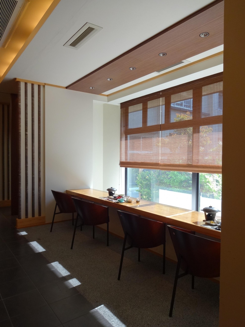 部屋のデザインははミニマルシンプル、食堂やロビーはクラシカルなモチーフを用いたモダンデザインです。広さも十分で水回りもきれいです。泊まった部屋はシャワーのみでバスタブはありませんでした。廊下にはミニバーがあり、アルコールはありませんが、コーヒーや数種類の紅茶・炭酸水はフリーです。南部鉄瓶風のきゅうすもありました。
