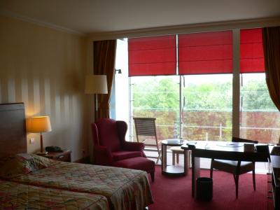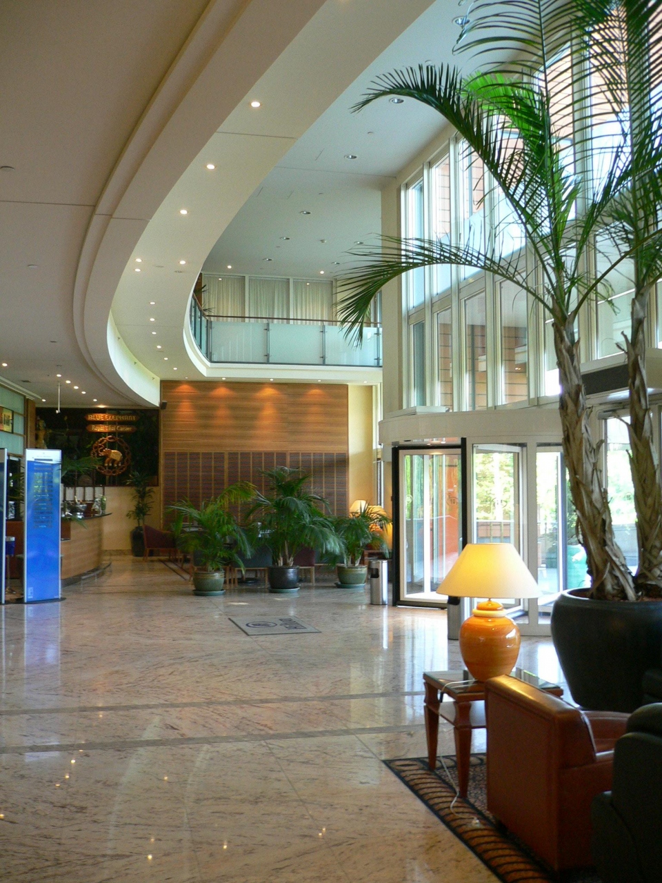 ホテルは施設全体を貫く吹き抜け空間を挟むような形で、泊まった部屋は公園側に面して景色もよく、静かでした。外観からもわかるように、窓は全面ガラスで明るく落ち着けます。部屋の広さも十分で快適です。