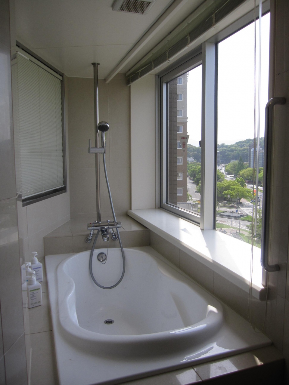 部屋は建物先端のコーナーダブルに宿泊。ビューバス目当てでしたが、このビューバスとても入りにくいし出にくい。あふれた湯が洗面の床を濡らして使いにくい。まあ外の景色が見えるからいいかという程度。