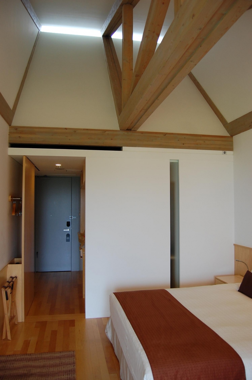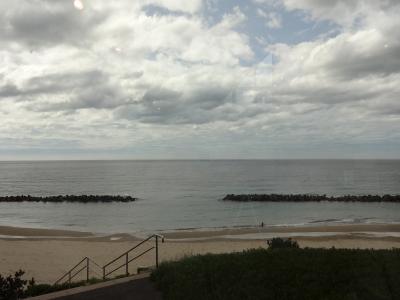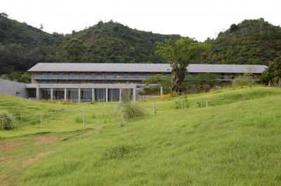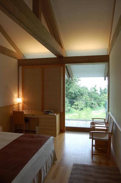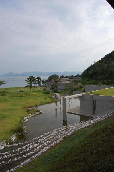 オーバル棟はなかなか予約が取れない。ミュージアム棟は少し予算が…と言うことで今回はパーク棟の2階に宿泊。こちらも安藤忠雄氏の設計。宿泊室や廊下はそんなにコンクリートしておらず、普通に快適。2階は屋根の形に天井が高く、海を見渡せるバルコニーがなかなか良い。食事もレストランはややお高い。持ち込みで景色を見ながら楽しむのも良いかも。
