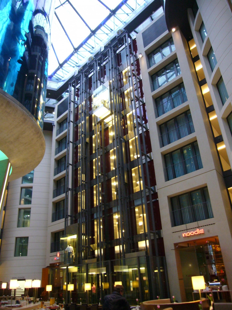 やはりこのホテルの特徴は、ホテル中央にある8階分の吹き抜けの中にあるシリンダー状のアクアリウム(水族館)です。夜にホテルにつきましたが、照明効果で美しかったです。シリンダーの中にはゆっくりと動く見学用エレベーターがあり中からのぞけるようです。