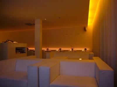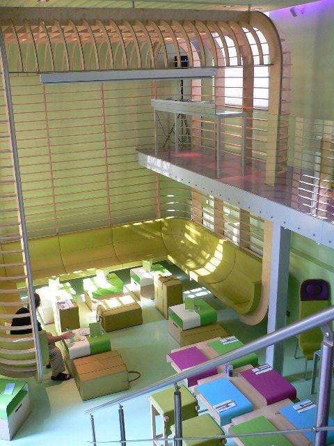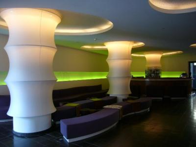 外観はすっきりしたデザイン、インテリアは原色を随所に使った若々しいデザインです。照明もなかなか凝っていて、夜の姿もまた魅力的です。