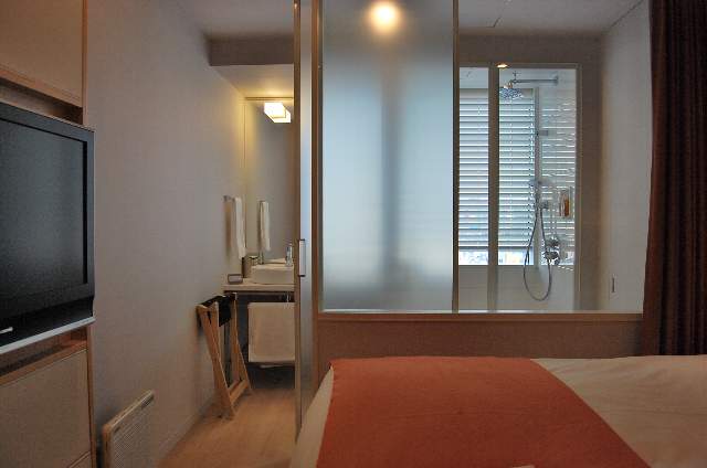 床は大柄なフローリング。照明も暗くも明るくもなくちょうどいい感じ。広さもまずまず合格点でしょうか。窓は床から天井近くまであり、朝は開放的で気持ちがよいです(外の景色はいまいち)。バスルームはガラス張りで、風呂に入りながら部屋の壁掛けテレビが見られます。バスタブはちょっとつかるには小さいです。その他随所におしゃれな雰囲気が漂っています。