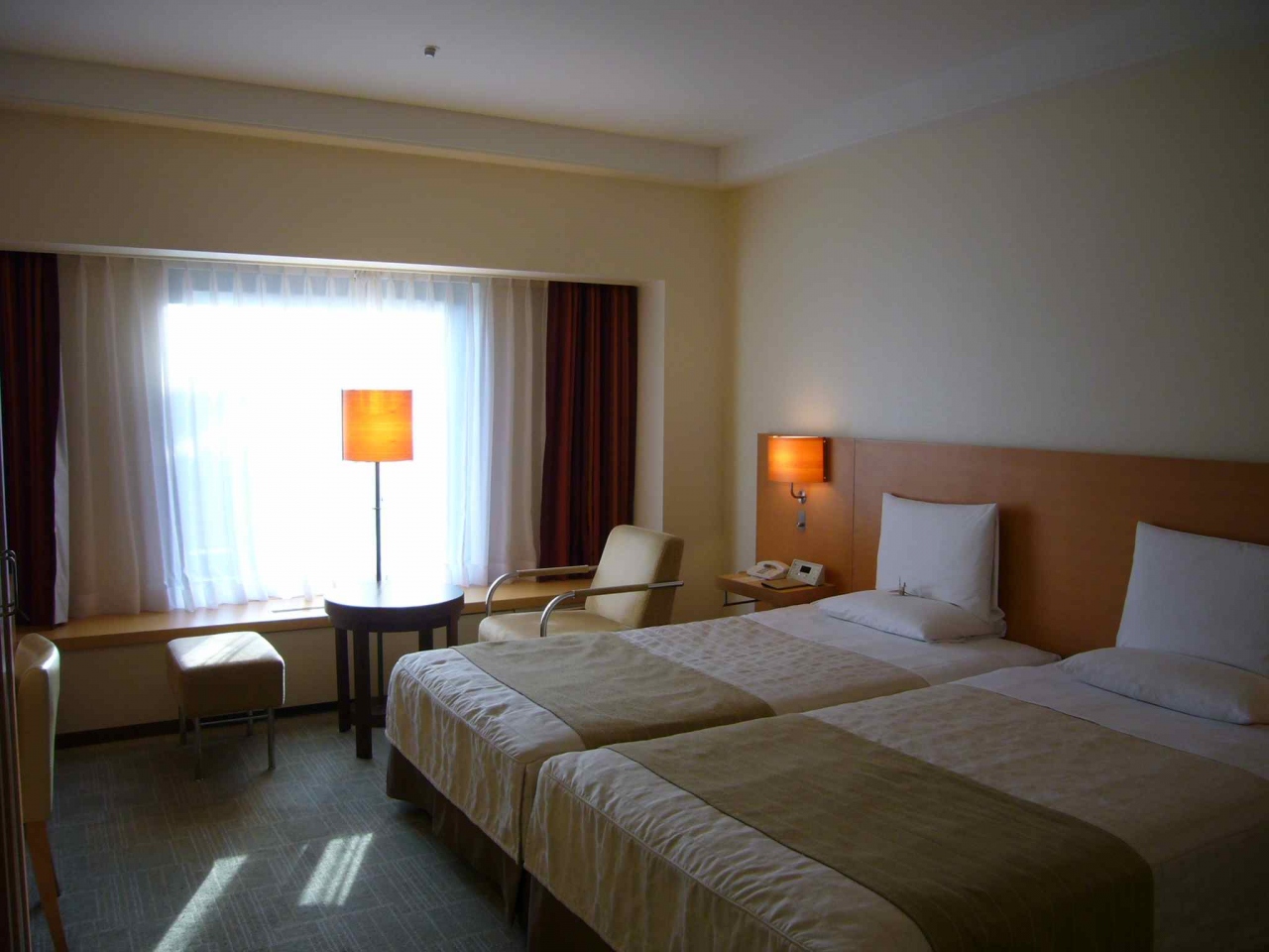 部屋は1014号室に宿泊。避難経路の図を見るとやや広い部屋のようで、ゆったりしていました。もちろん足元から天井まで、二重のガラス張り。当然市内の眺めはとてもGOODです。ガラスとガラスの間には電動のブラインドがあります。