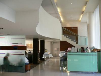 デザインはまずまず頑張っています。ここはメキシコ?というぐらいメキシコ色は一切ありません。さらに周辺はメキシコシティーでも高級住宅地だからでしょうか地元のハイソでスノッブな方々の利用が目立ちました。写真は受付と朝食が取れるカフェです。朝食は80ペソですが、ホットミールはありませんでした。