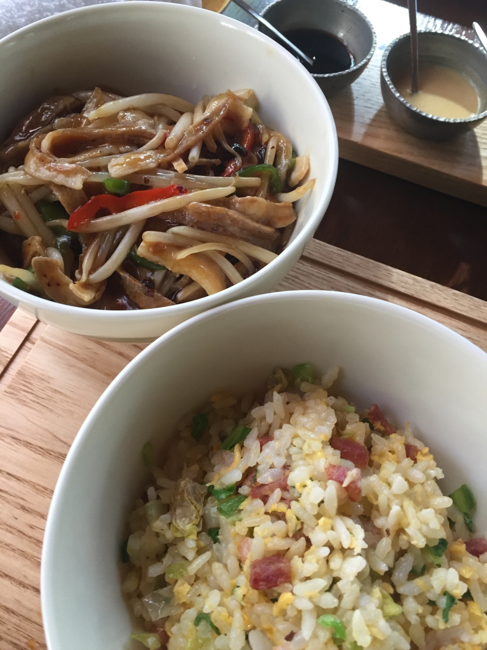 点心5点とスープと焼き飯焼きそばなどとデザート。