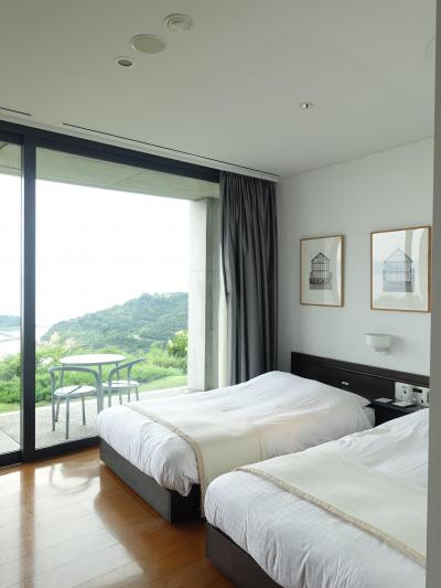 部屋はデザイナースルームにしましたが、あんまりデザインの良さは感じませんでした。当館専属デザイナーとのこと。部屋からは海が一望です。