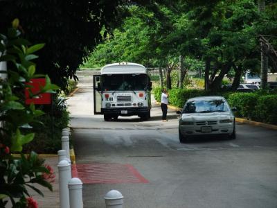 今回はH.I.S.を利用したので、白いバスが移動手段です。赤いバスには...