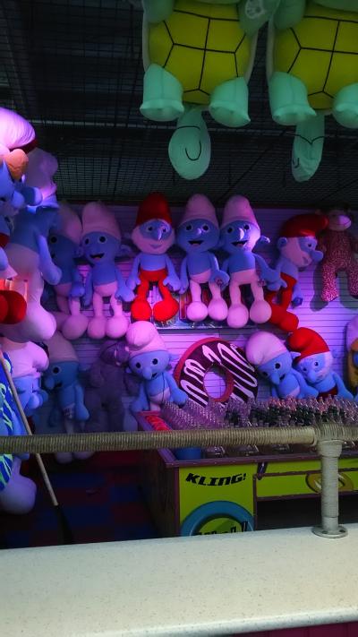 ピアの遊園地内にあった、ゲームセンターにて。友人がこのスマーフを本気狙...
