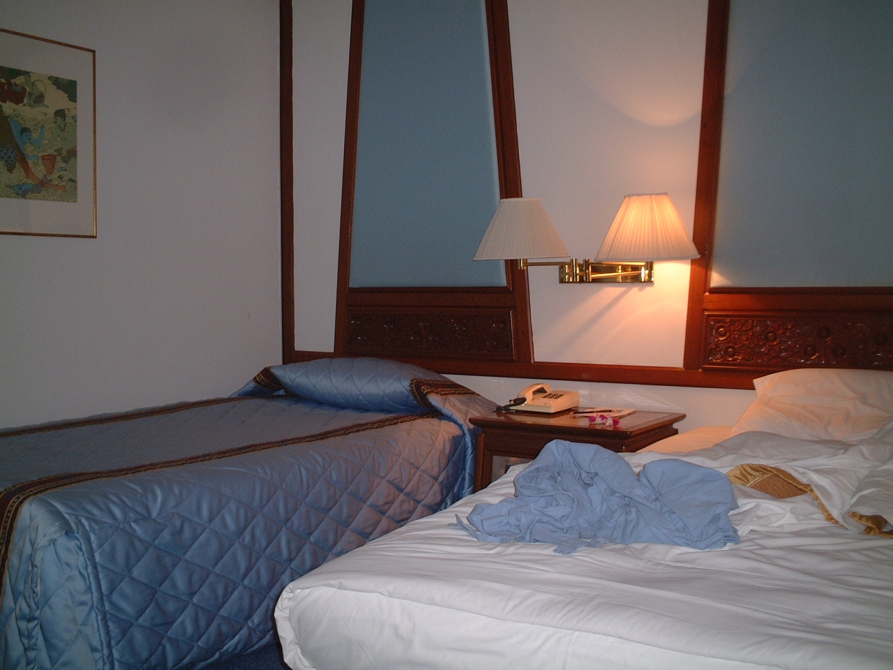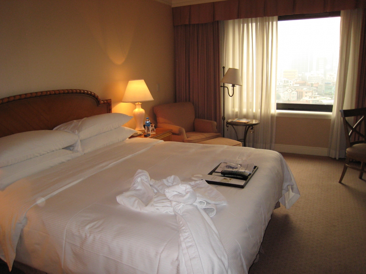 8月末に2泊しました。フロントに入った時に不吉な感じがしましたが、部屋に入り、後悔しました。他の評判どおり古いですが、私の想像以上に古いです。客観的に書くとドアは押しボタン式の渋い物(もちろんオートロックではなし)、椅子は肘掛が木製ですが、擦れて骨董品のよう。座面も所々擦れてます。座って休まる気がしません。バスルームはタイル張り。使いにくいシャワーで自分の頭より高い位置にかけるしかない。ただし、バスタブはやや深めで、ひざも肩も湯に同時に浸かれる。韓国はシャンプーが有料の所が多いようですが、ここは大きなタンク式のが置いてありました。カーペットに染みが少なからずあり。なぜか殺虫剤が置いてある。変圧器を借りたら、本体が弁当箱の大きくしたような重いもの。(借りれるだけいいかな)日本によくある古ーい温泉旅館のイメージです。
