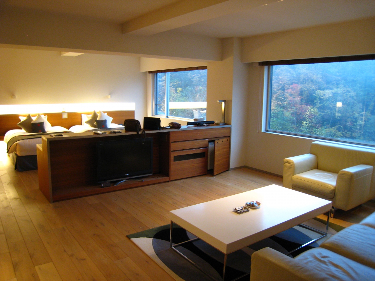 3人で一泊しました。100?の客室は文句なく広く、内風呂も湯量豊富で広さも十二分で、大浴場に行く必要もないくらいです。食事も素材・味付け共に申し分なく美味しかったです。雑誌・DVDの貸し出しもあり、ラウンジの飲み物も無料です。価格は安くはないですが、内容考えると、安いのではないかと思います。また、来たくなるホテルでした。