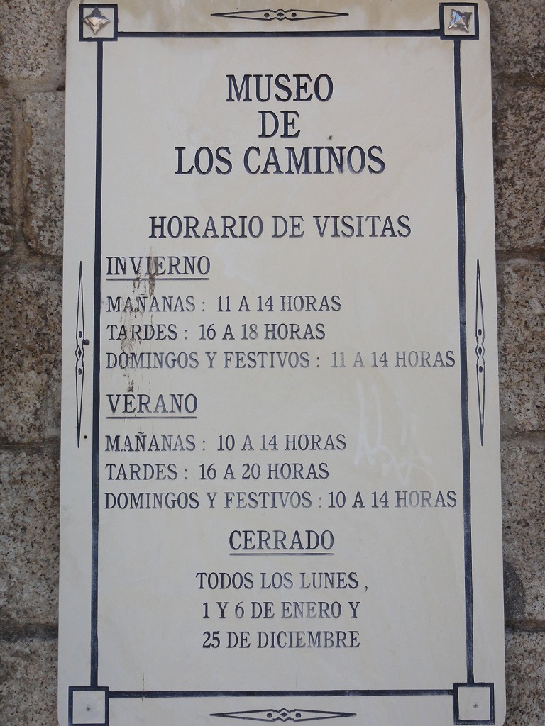 アストルガの巡礼博物館(Palacio Episcopal)、大聖堂(Catedoral:Templo)、大聖堂美術館(El Museo Catedoralicio)、チョコレート美術館(Mueseo del Chocolate)の開館時間、料金の一覧表は、こちらで(2011年現在)。