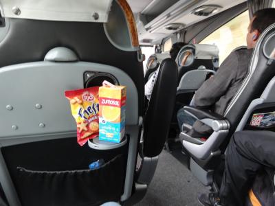 私はポンフェラーダ~サンティアゴ間で利用したのですが、乗車後すぐにおつまみが配られます。そのあと、各自に希望のドリンクを聞いて持ってきてくれます。2回サービスがありましたが、おかわりは自由のようです。