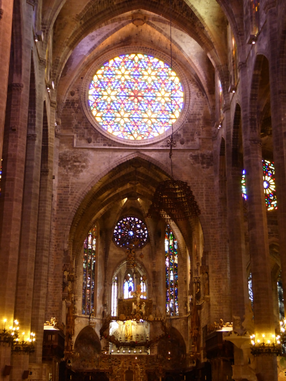 ガウディが主祭壇の天蓋を手掛けたことで有名なパルマの大聖堂は、海に面して建っているので午前中に見学すると波と光の効果で非常に美しく反射する色が見れると言われています。残念ながら私は朝のカテドラルを見学することはできなかったのですが、天気の良い日だったので、16時を過ぎていましたが光を受けたバラ窓やステンドグラスはきれいに輝いていました。
