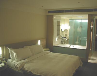 ウェスティンホテルの室内。 夜になるとこんな感じで、ガラス越しにバスル...