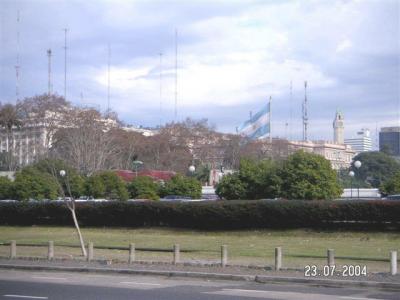 ブエノスアイレス 市内のコロン公園。巨大なアルゼンチン国旗がたなびいて...